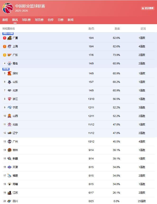 浙江13胜10负第8,宁波12胜11负第9,山西12胜11负第10,而辽宁掉到第11位!
